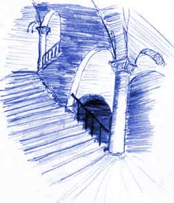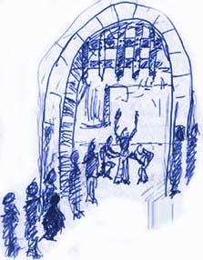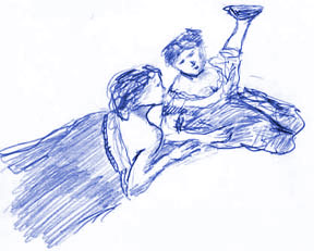 This morning I awoke . . .. . . in the luxurious, perfumed bedof a famous Milanese courtesan. No, no, no! Don't get the wrong idea! I didn't have sex with her! What do you take me for? *looks at the floor, hurt* *looks up with big puppy eyes* *laughs* She wasn't even in the bed! No, there were three other women and two other men in the bed with me! *waving hands* Wait, wait! Don't get the wrong idea about that either! Hold on! Hold on! Lemme explain! Starting OverDear You!Hi! So much has happened in the last 24 hrs Unbelievable! And I only have a few minutes before we have to take this laptop over to the mansion where Regine's staying So, it took us 3 hours . . .. . . just to get through![]() the 'metal detectors' at the North Gate where the Visconti Guards searched us for concealed weapons (we deposited our swords & lances into their armory) Then it's just so bizarre . . .. . . to be in a city again!In little villages people are pretty much in awe of us Here it's "Yeah, yeah, right . . . Blah Company --- whatever! Nice dirty 'uniforms'! Now get your horse out of my frickin' way!" Master NetworkerSo we split offfrom the main group and Skip starts working his charm on the underground network of servants and bodyguards and so . . . Yesterday afternoon found us . . .walking up![]() these stairs (so beautiful to see, after 11 months of tents, mud huts and twig shacks) to Louder's apartment Meet LouderSpelled L A U R APronounced "louder" . . . and yes, she's a courtesan, but . . . --- it's not like you think --- there's no sexual tension at all because we aren't anywhere near being able to afford her professional prices. She has a regular Noble Sugar Daddy He's occupied with the Visconti Wedding The main thing about her is that shes really smart and well-read and every night that she's off work (which is most nights) Her apartment --- which is SFB (So Fucking Beautiful) tapestry, glass windows, rugs, chairs . . . she owns 12 books!!!!!!! --- becomes a drop-in slumber party for all the cool misfits in town! Imagine . . .. . . a beautiful square Renaissance roomwith all the colors fresh!!! and blazing like noon with beeswax candles!!! full of about 10 of her friends (courtesans, actors, musicians, tutors, renegade monks, defrocked nuns, travellers, translators, troubadours) and about 5 of us 21st century miscellaneous knuckleheads hanging out feeling just like a cool artist's birthday party from our era I mean exactly like it! I haven't felt so comfortable with natives the whole time I've been here! Louder and her gang are so . . . well . . . normal! They know there's something really weird about us They can't put their fingers on it but it doesn't freak them out. Shoe RebelsThere was a lot of shoe talkThe men Louder's gang are really into shoes the longer the toes the better ![]() Long toes are supposed to be only for the nobiltiy only so these guys, technically, could get arrested for their shoes Streetwalkers wear stilts ![]() to keep their dresses clean ![]() Skip got pretty good at the stilts which cracked everybody up Doing LinesSo . . . during dinner(cooked for the whole building by geniuses in the basement) Louder and her nun friends lay on her bed and poured precious white powder onto an iron mirror separated it into little piles with a dagger and held it up ![]() so we could put it in our stew Salt! I haven't had added salt in almost a year Ojeezuzgod it tasted so good! Lucky, Lucky Me!I got to hear what is probably 1st-class lute playing(it's incredibly soft and muted sounding but all the guy does is practice so the skill level is sky high it sounds like Indian sitar music) And they told long stories in this really formal way and I really couldn't tell a lot of times if they were true stories or not It was simply TFC (Too Fucking Cool) and the reason it turns into a (non sexual) slumber party is that the streets aren't safe after dark Louder fell asleep on the trunk at the foot of her bed OK, Everyone Else Who's